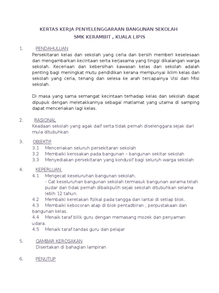 0 0 menganggap dokumen ini bermanfaat Tandai dokumen ini sebagai bermanfaat. KERJA-KERJA MEMBAIK PULIH TAMAN POKET DESA AMAN DI JALAN ABC BANDAR PQR. KERTAS KERJA PENAMBAHBAIKAN INFRASTRUKTURTANDAS SEKOLAH SERTA KESELAMATAN MURID 10 PENGENALAN Sekolah Kebangsaan Rompin meupakan salah satu sekolah yang terbesar yang ada didalam kawasan DUN Jeram Padang.